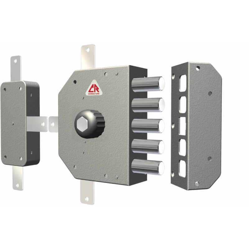 SERRATURA QUINTUPLICE APPLICARE CON POMOLO S/SCROCCO A POMPA 3300P - mm.60 DX (3300P-02) - 2 mandate, scatola in acciaio verniciato, catenacci a pistoni con interasse mm.28 in acciaio cromato, cilindro a pompa lato esterno, pomolo lato interno, dotazione: 1 mostrina cromata, 1 ferrogliera, 1 deviatore, viti e minuteria, 3 chiavi a pompa, aste non comprese