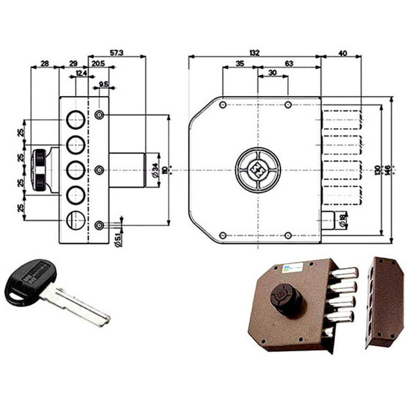 Serratura Pompa Applicare Legno Chiusura Laterale- Pomolo Interno Catenacci Laterali 4 Pistoni E Scrocco Misura Scatola Mm 132X146X30 - Entrata Mm 63 Diametro Cilindro Mm 34 Lunghezza Mm 50 Dotazione 3 Chiavi Testa Plastica C10