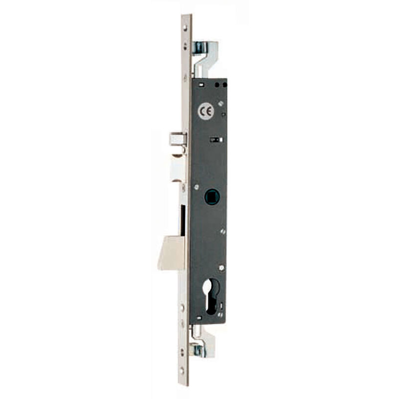 E 35 Chiusura triplice. Quadro maniglia mm 8, scrocco autobloccante. Dotata di due ghiere, un sottofrontale in nylon, viti di fissaggio. Frontale inox.