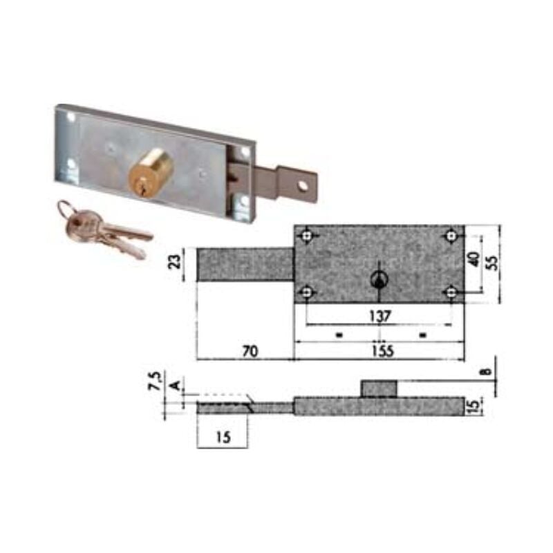 Sx mm.155x15x55h. (41525782) per serranda, scatola in acciaio con rivestimento in zinco, cilindro fisso, lunghezza mm.5,5 in ottone, catenaccio zancato, 2 mandate con corsa da mm.25 - dotazione 2 chiavi per l'esterno, 1 chiave per l'interno Categoria merceologica: Serrature, chiusure di sicurezza e accessori - Sicurezza - Serrature per serranda
