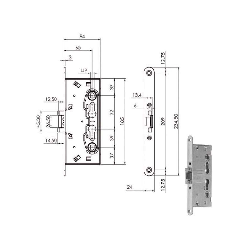 Serratura zincata infilare porte tagliafuoco Scrocco catenaccio incorporato Q9 - 1 mandata Scatola mm 84x185 Frontale mm 24x234 - Entrata mm 65 Cilindro non incluso