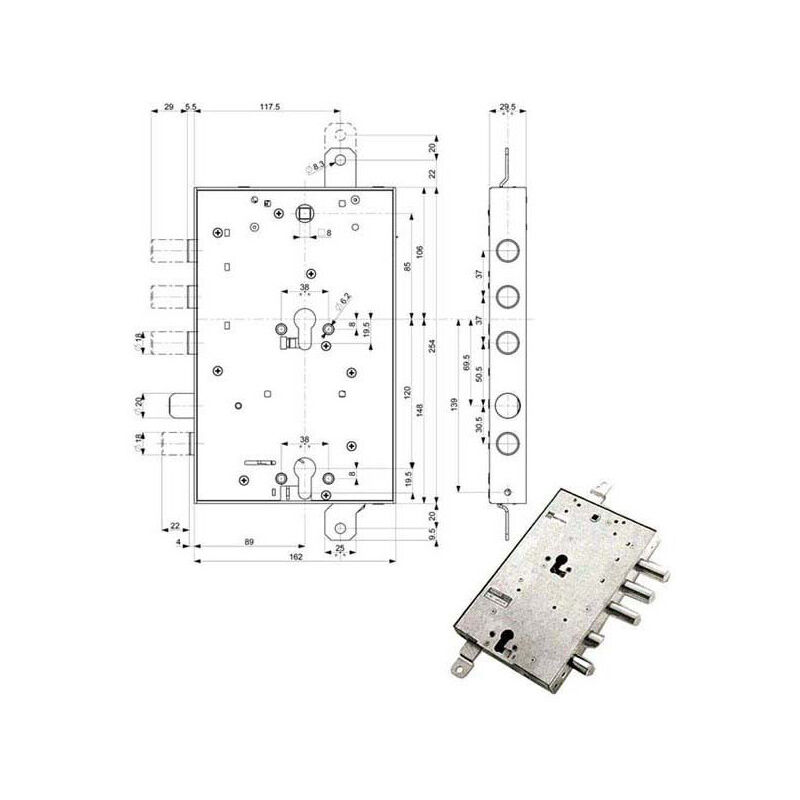 Serratura doppio cilindro europeo a planare Fori protettore mm 38 2 chiusure verticali Catenacci laterali 4 pistoni e scrocco Interasse catenacci mm 37 Scatola mm 162x254x30 - Entrata mm 89 Cilindri non inclusi