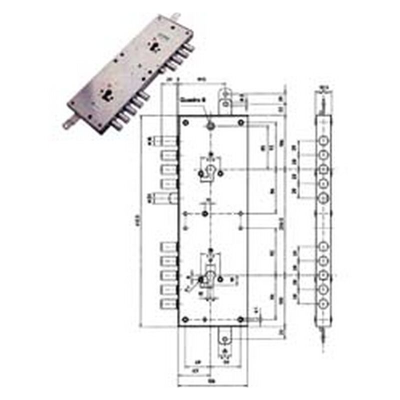 Scatola mm.136x412,5h. in acciaio con rivestimento in zinco, catenacci e scrocco in acciaio nichelato, 2 mandate, quadro maniglia passante - cilindro e aste non compresi