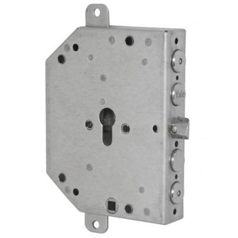 Cilindro a profilo europeo, chiusura triplice, scrocco comandato dalla chiave e dal quadro maniglia. 4 catenacci, corsa mm.29. Scatola zincata mm.164x130x32. A planare.