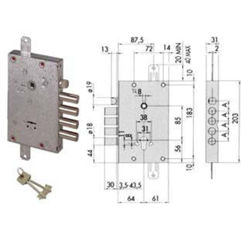 Scatola in acciaio con rivestimento in zinco, 4 mandate, catenacci e scrocco in acciaio nichelato, scrocco reversibile, quadro maniglia mm.8 passante, interasse mm.85 - predisposizione per chiusura supplementare, dotazione: 3 chiavi, aste non comprese