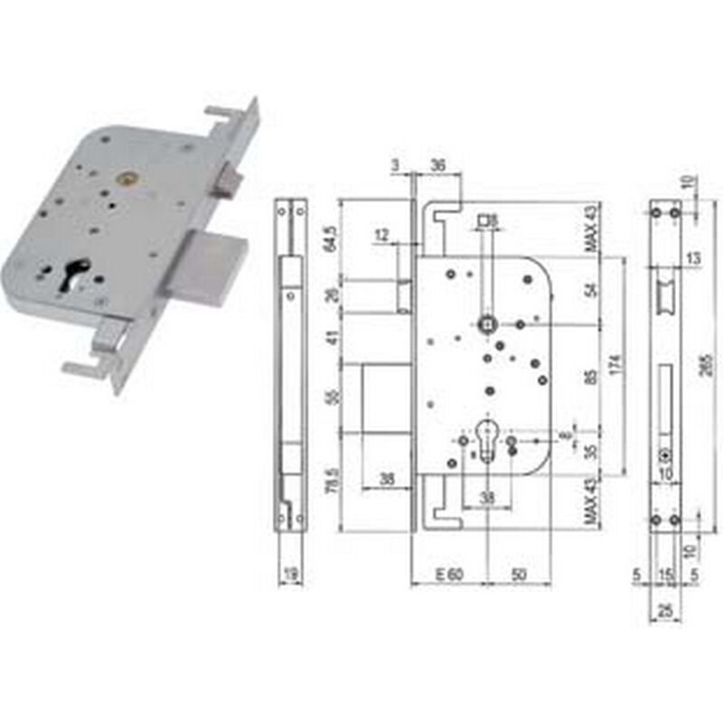 Scatola e coperchio in acciaio zincato - piastra frontale e contropiastra nichelate - 3 mandate - triplice chiusura - azionamento a cilindro - catenaccio cromato - in dotazione: contropiastra in acciao nichelato, coppia bocchette foro cilindro in ottone