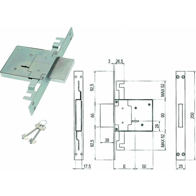 SERRATURA TRIPLICE DA INFILARE DOPPIA MAPPA 450/3S - mm.70 (00450 3S 70 2C CI) scatola e coperchio in acciaio zincato - piastra frontale e contropiastra nichelate - catenaccio cromato - 4 mandate - triplice chiusura - in dotazione: contropiastra in acciaio nichelato, viti di montaggio, 2 chiavi cifrate, bocchette copritoppa in ottone