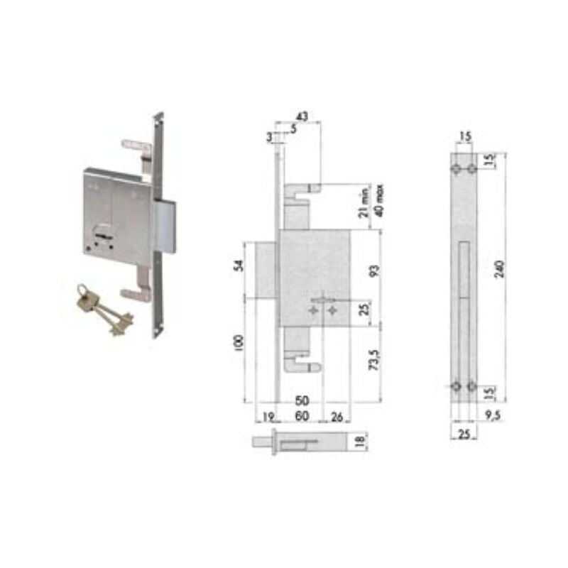 Mm.60 (57226600) scatola e frontale in acciaio con rivestimento in zinco, 2 mandate, catenaccio in acciaio nichelato, predisposizione per chiusure supplementari, dotazione borchia interna in acciaio, boccole filettate, aste non comprese, 2 chiavi, scatola mm.93h. Categoria merceologica: Serrature, chiusure di sicurezza e accessori - Sicurezza - Serrature a doppia mappa da infilare