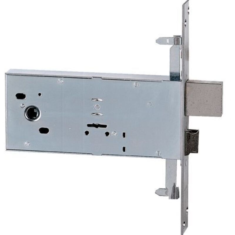 Chiusura triplice - agganci aste ad innesto - 2 chiavi da mm.79 - frontale acciaio zincato mm. 240x25x3 - altezza cassa mm.82 - quattro mandate da mm.9 - scrocco separato reversibile - richiamo scrocco con chiave o quadro maniglia mm.8 - 2 ghiere - viti d