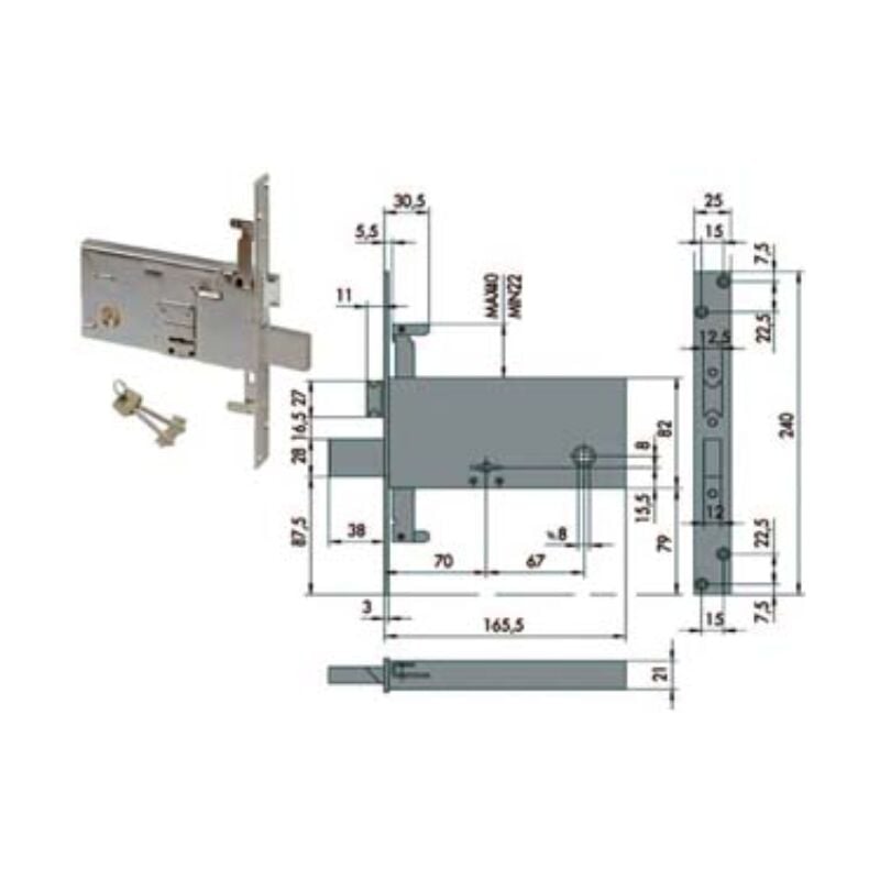 Mm.70 (57318730) quadro maniglia, 4 mandate, con catenaccio, scatola e frontale in acciaio con rivestimento in zinco, catenaccio in acciaio nichelato, con quadro maniglia da mm.8 passante, piastra di protezione antiscasso, predisposizione per chiusure supplementari, dotazione borchia interna in acciaio, coppia di boccole filettate e 2 chiavi, aste non comprese, scatola mm.82h. Categoria merceologica: Serrature, chiusure di sicurezza e accessori - Sicurezza - Serrature a doppia mappa da infilare