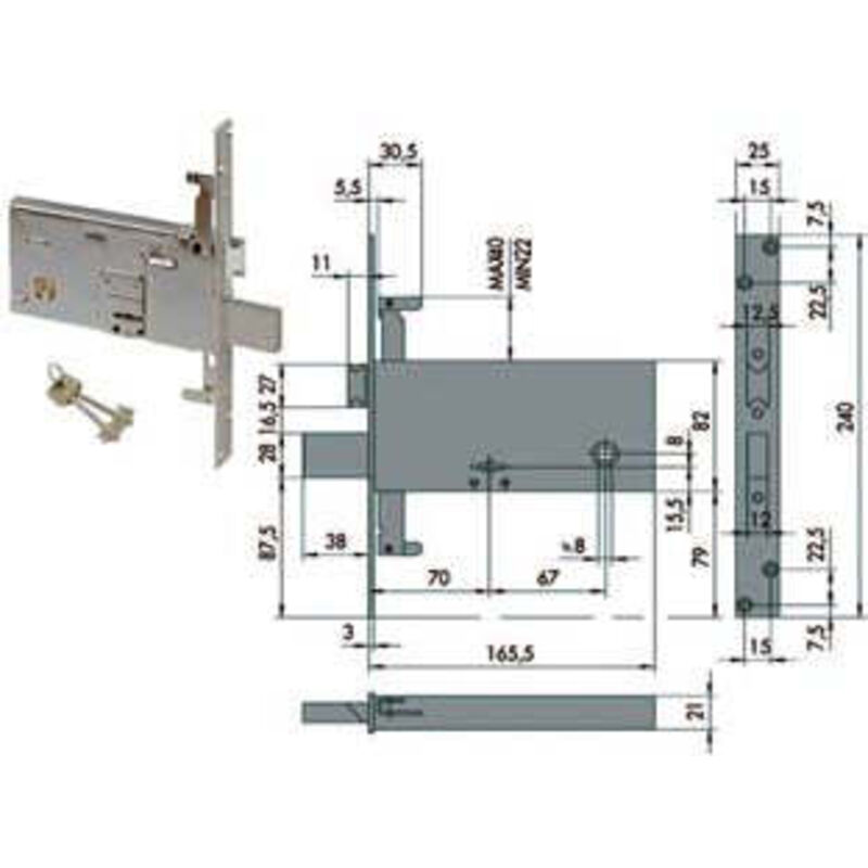 Quadro maniglia, 4 mandate, con catenaccio, scatola e frontale in acciaio con rivestimento in zinco, catenaccio in acciaio nichelato, con quadro maniglia da mm.8 passante, piastra di protezione antiscasso, predisposizione per chiusure supplementari, dotaz