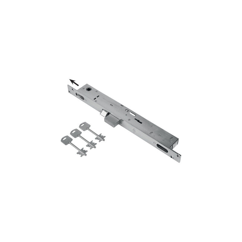 Finitura inox - meccanica con 3 punti di chiusura con incontro 6819/1 - catenaccio a 2 mandate - asole per montaggio aste - scrocco reversibile - predisposta per aste interne cod.6827-6828 e attacco aste esterne serie 6850 - interasse mm.170 - frontale mm.25