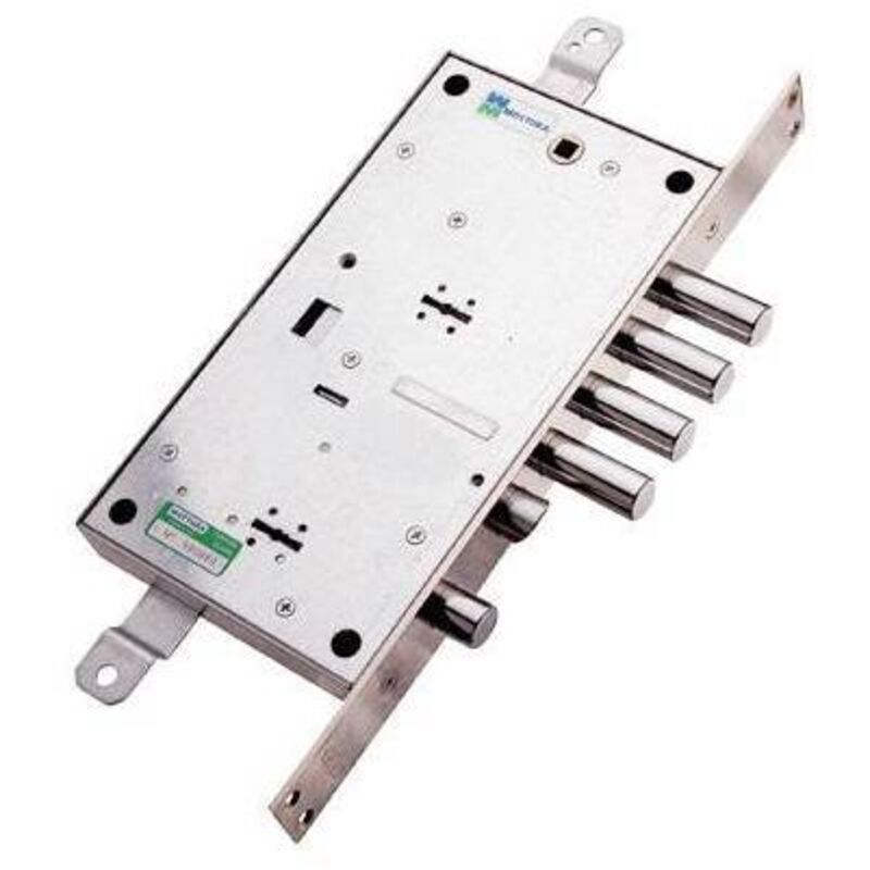 Scatola mm.136x254h. in acciaio zincato, piastra mm.356x35 - catenacci e scrocco a pistoni con interasse mm.28 in acciaio cromato, 4 mandate, scrocco azionato da chiave o quadro maniglia, dotazione: 1 mostrina interna, 1 mostrina esterna, 3 chiavi con gambo mm.40, aste non comprese