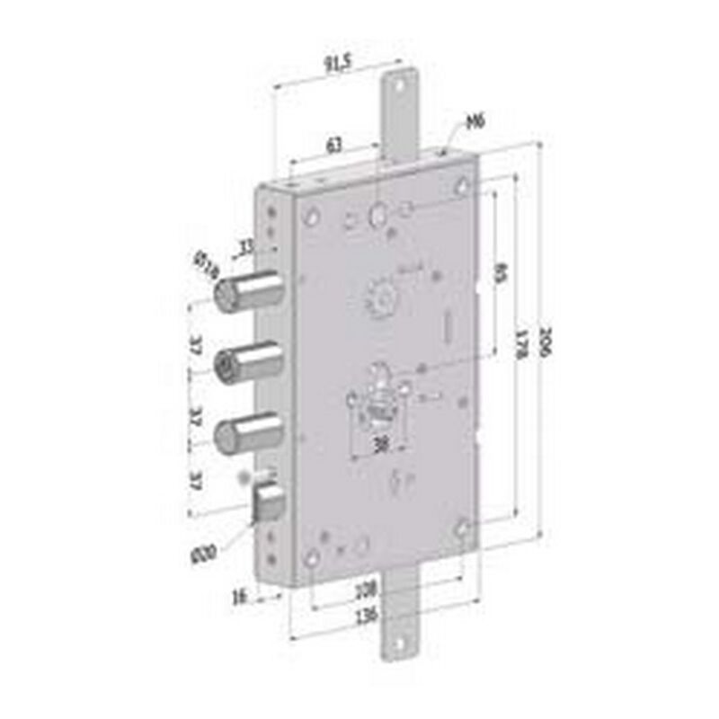 Scatola in acciaio zincato mm.136x206 - serratura a cilindro europeo con movimento ad ingranaggi, corsa mm.30, scrocco reversibile e chiusura triplice - catenacci in acciaio cromato - catenaccio movimentato dalla chiave - sporgenza pistoni mm.3 - serratur