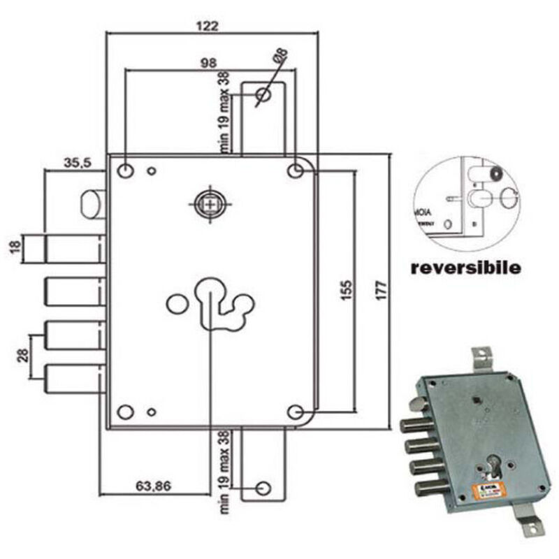 Serratura cilindro europeo a planare Movimento ad ingranaggi Fori protettore mm 38 2 chiusure verticali Catenacci laterali 4 pistoni e scrocco superiore reversibile Interasse catenacci mm 28 Scatola mm 122x177x30 - Entrata mm 63 Cilindro non incluso