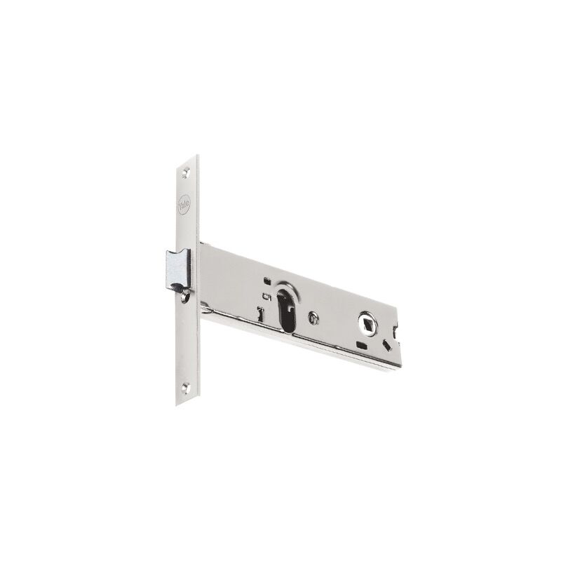 Per porte in alluminio con fascia stretta. scrocco reversibile e catanaccio incorporato, frontale in acciaio inox, cassa in acciaio zincato, scrocco nichelato, quadro 8. 2 mandate, entrata 70mm, frontale 22mm, interasse 67mm