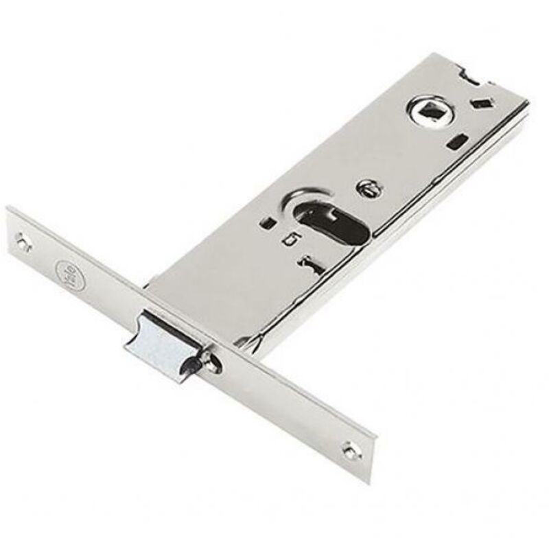 Per porte in alluminio con fascia stretta. Scrocco reversibile e catanaccio incorporato. frontale in acciaio inox. cassa in acciaio zincato. scrocco nichelato. quadro 8