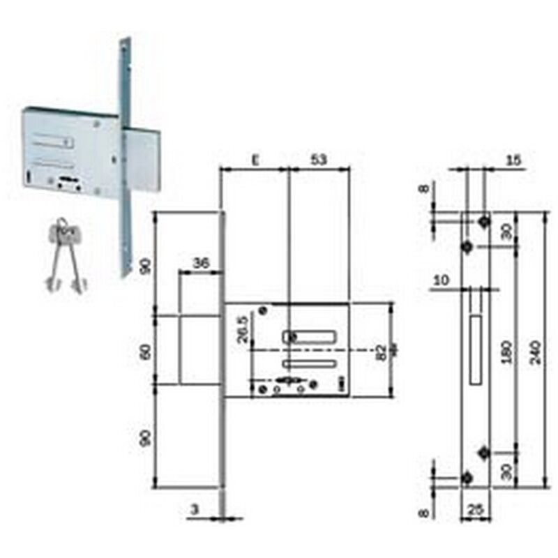 SERRATURE DA INFILARE DOPPIA MAPPA 661 - mm.70 (661704N) chiusura laterale - a chiave doppia mappa - scatola zincata -frontale zincato mm.240x25x3 - catenaccio rettangolare a 4 mandate da mm.9 - 2 chiavi