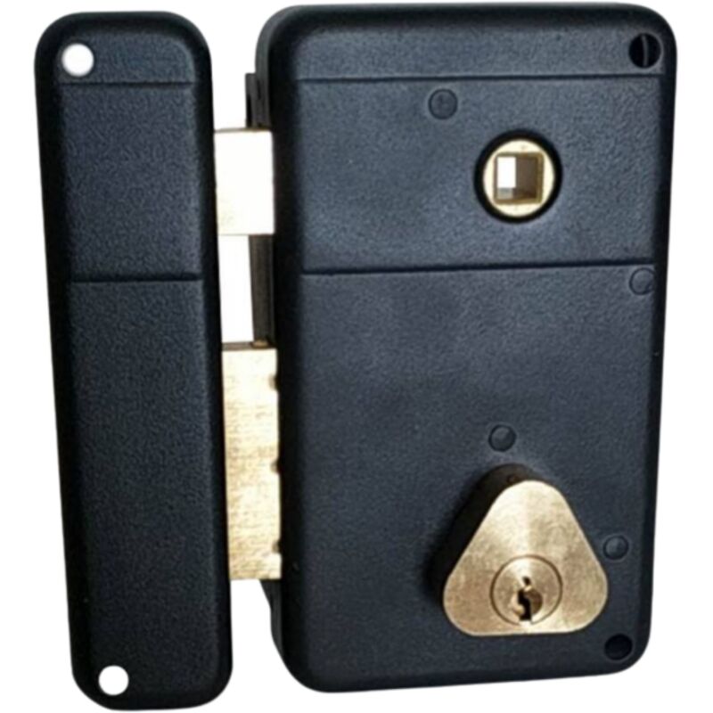Sicurezza verticale nera con cilindro rinforzato da una massa decorativa triangolare in ottone. Tronco 130 mm di altezza x 78 mm di larghezza. Movimento con 2 giri di chiave. Cilindro tondo in ottone diametro 25 mm x 50 mm di lunghezza. La funzione di 1/2 giro sulla chiave, cioè la chiave aziona il 1/2 giro triangolare senza dover manovrare la maniglia per l'apertura, su entrambi i lati del cilindro 5 chiavi in ottone nichelato fouillot 7x7mm Mostrato a sinistra Fornito con contropiastra e accessori per l'installazione