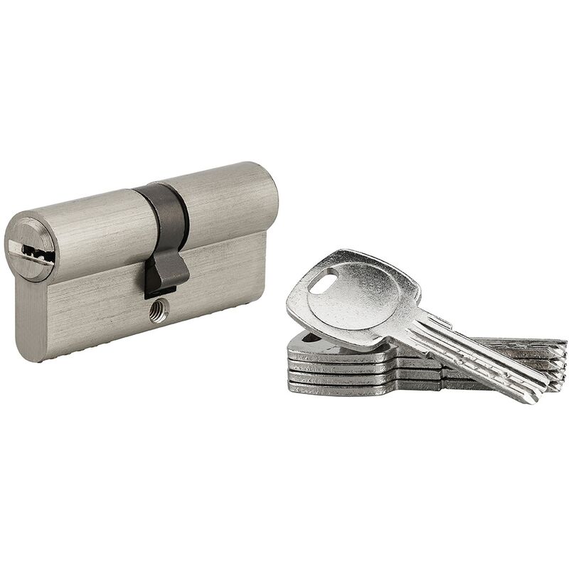 Profilo Euro in ottone. Meccanismo a 10 pin. Perno in acciaio temprato per proteggere dalla perforazione. pin antiperforazione. 5 chiavi piatte reversibili, acciaio nichelato.