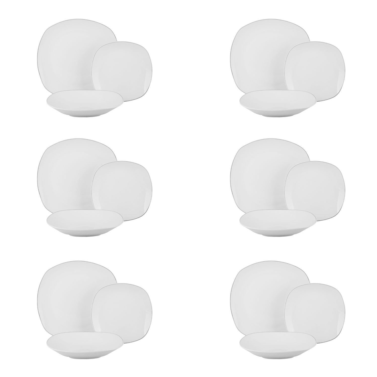 Per una tavola elegante Versailles è la scelta perfetta. Questo bel servizio piatti in porcellana ti conquisterà con il suo candido design bianco, ma la vera chicca è il bordo in filo platino. Sarà il dettaglio che farà la differenza portando un tocco di luce e raffinatezza in tavola. I piatti dalla forma quadrangolare si compongono di piatto piano, fondo e frutta per 6 persone.
