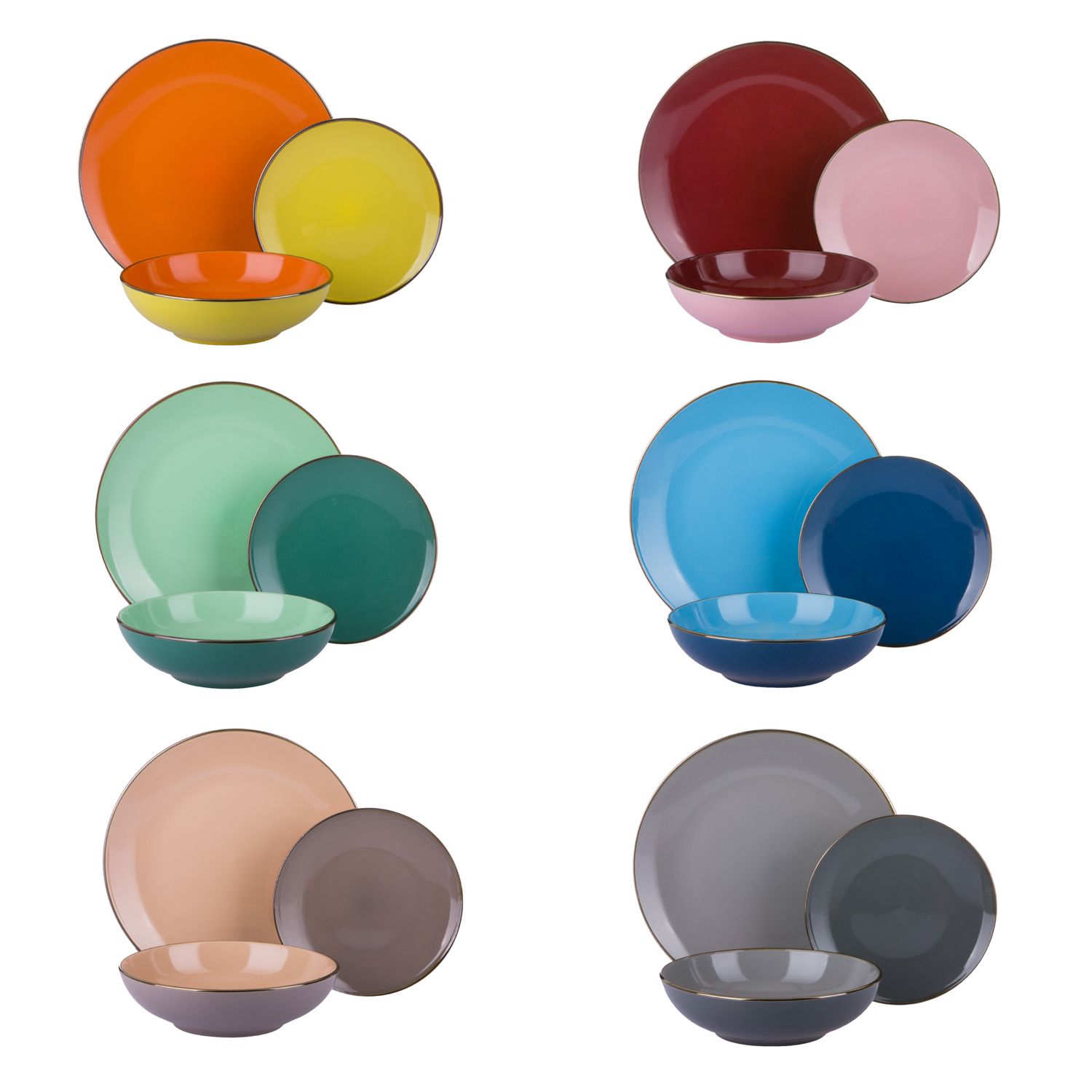 Double è il servizio piatti perfetto per chi ama portare il colore in tavola! Un set piatti adatto per i tuoi pranzi di ogni giorno, personalizzando ogni posto tavola con una diversa tonalità tra le 6 che lo caratterizzano. Realizzati in resistente ceramica stoneware, i piatti di questo set tavola sono impreziositi da un bordo metallizzato e da 6 brillanti tonalità con doppia sfumatura. Che stupendi contrasti di colore sulla tua mise en place! Potrai apparecchiare una tavola completa per 6 persone, dal primo al dolce, con piatto piano diametro 27 cm, piatto fondo diametro 21 cm e piatto frutta 19,5 cm. I piatti sono lavabili in lavastoviglie. Non utilizzabili nel forno a microonde.