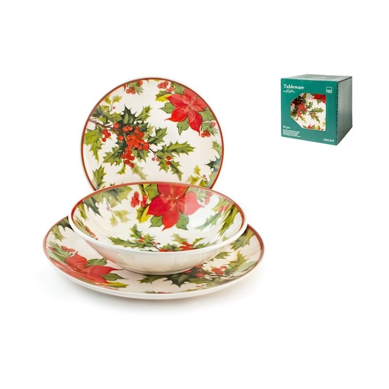 Servizio 18 pezzi tavola h&h holly jolly in stoneware decorato. servizio composto da 6 piatti piani cm 26, 6 piatti fondi cm 20,5 e 6 piatti frutta cm 18,5.