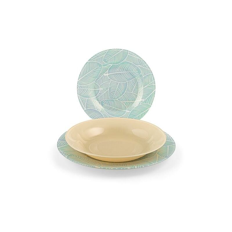 Servizio tavola 18 pezzi Leaves azzurro in vetro decorato. Servizio composto da 6 piatti piani cm 26, 6 piatti fondi cm 22 e 6 piatti frutta cm 19.