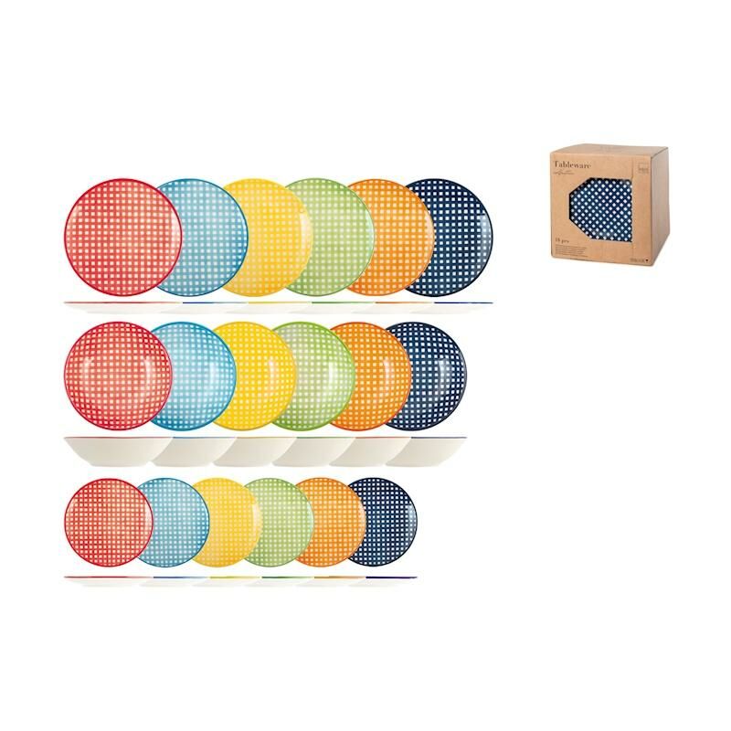 Servizio tavola vicky in stoneware decorato colori assortiti. servizio composto da 6 piatti piani cm 25,5 peso 0,720 gr, 6 piatti fondi cm 20 peso 0,460 gr, 6 piatti frutta cm 18,5 peso 0,340 gr.