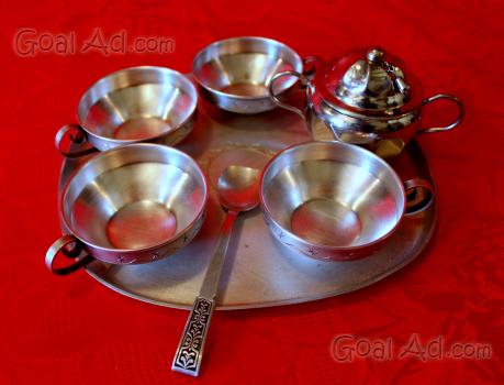 Servizio di 4 tazzine + vassoio in lega d'argento. Figurano bene in una vetrina o esposte in cucina. Offro a € 40. La zuccheriera cromata è in omaggio.