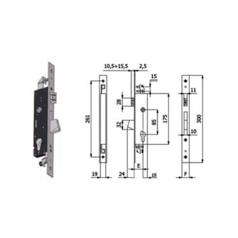Mm.30 interasse mm.85 (1410.30.25) scatola e coperchio in acciaio zincato e plastificato - scatola serratura mm.19 l. - frontale in acciaio inox mm.25 - catenaccio autocentrante in lega speciale nichelata con sistema antiscasso mm.10 l. - scrocco anti-rumore in lega speciale nichelata - catenaccio comandato dalla chiave - scrocco comandato dalla chiave o dalla maniglia - reversibile - 1 mandata - in dotazione: 2 borchie, sottofrontale, vite cilindro, viti di fissaggio in acciaio inox, istruzioni di montaggio - cilindro non compreso Categoria merceologica: Serrature, chiusure di sicurezza e accessori - Sicurezza - Serrature per montanti da infilare