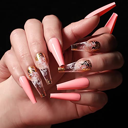 Sethexy Lungo Ballerina Unghia falsa Lucido Bara Unghie finte Oro Glitter Chiodi con colla 24 Pz Bling Acrilico Premi sulle punte delle unghie per donne e ragazze (Rosa)