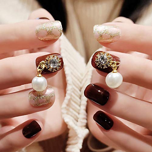 Sethexy Lucido Squovale Corto Unghie finte Marrone luccichio Perla Studs Copertura completa Acrilico 24 pezzi Unghie finte Suggerimenti per donne e ragazze