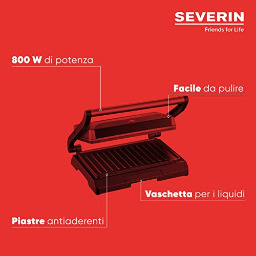 Dettagli prodotto - Bistecchiera SEVERIN da 800W, dimensioni della superficie grill 23 x 14,5 cm, design compatto e salvaspazio, vassoio per i liquidi, piastre con rivestimento antiaderente, KG 2394