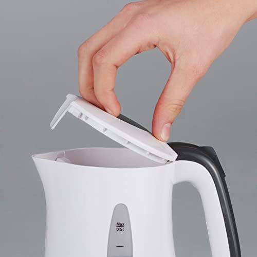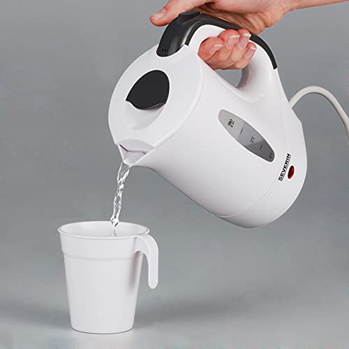 SEVERIN WK 3644 Bollitore elettrico compatto da 650 W, Bollitore da viaggio capacità di 0,5 L, Bollitore acqua con 2 tazzine e 2 cucchiaini di plastica in omaggio, Bianco