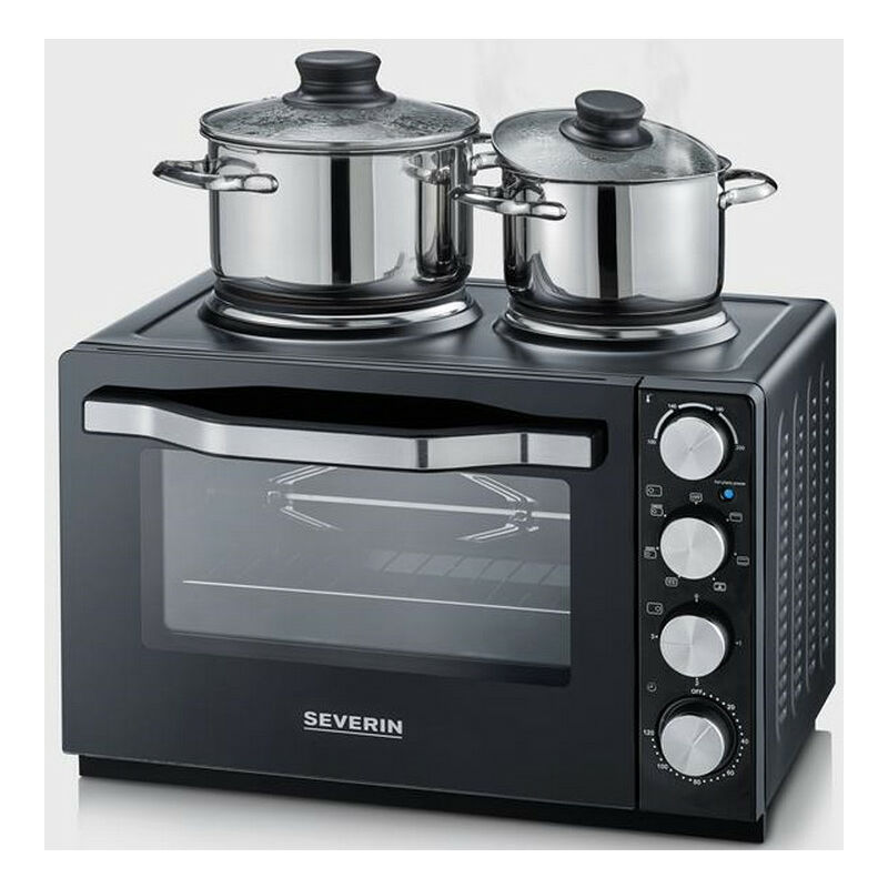 Forno a libera installazione + 2 piastre Severin 2065. Un mini-forno compatto e pratico: ideale per gli studenti in studio! Interruttore a 7 posizioni: Off / Resistenza volta / Resistenze volta e pavimento / Resistenze volta e pavimento in circolazione d'aria calda / Resistenze volta con girarrosto / 2 livelli di temperatura per la piastra grande. Tipo di prodotto: Forno a libera installazione. Capacità: 30 L. Potenza: 2500 W. Potenza del forno 1500 W. Tipo di cottura: Convezione naturale / Aria calda / Volta e pavimento. Termostato: 230 ° C. Pulizia del forno: manuale. Accessori: 1 griglia / 1 luogo di cottura / 2 manici / Girarrosto. Il prodotto +: Ideale per piccoli spazi Programmazione meccanica. Temperatura regolabile tra 100 e 230 ° C. Piastre di cottura (15,5 e 18,5 cm) con potenza di 1000 W e 1500 W. Cottura simultanea al forno con la teglia piccola. Timer da 120 minuti con spegnimento automatico e segnale acustico. Illuminazione interna di alta qualità e rivestimento