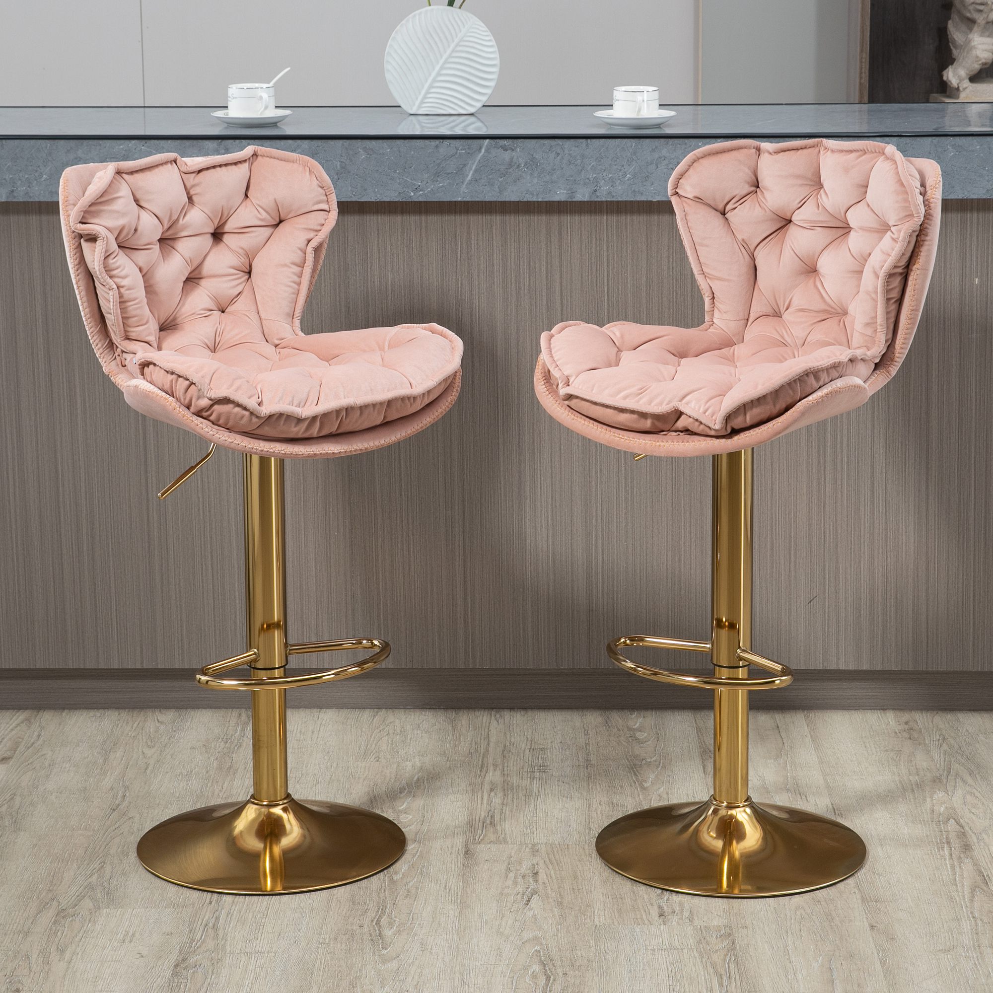 I Sgabelli da Bar Girevoli combinano eleganza, comfort e funzionalità in un design unico e moderno. Rivestiti in un lussuoso tessuto in velluto color avorio, questi sgabelli regolabili in altezza con poggiapiedi offrono non solo una seduta confortevole grazie alla loro ergonomia, ma anche un tocco di classe a ogni ambiente. La struttura in metallo e legno assicura durata e stabilità, mentre la capacità di regolazione dell'altezza e la funzione girevole a 360 gradi li rendono perfettamente adattabili a qualsiasi contesto della casa. Facili da montare, arricchiranno la tua cucina o sala da pranzo con stile e raffinatezza.