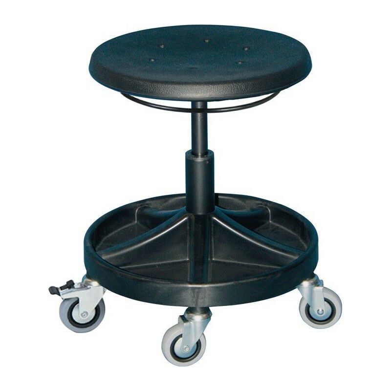 Sedile: PU nero Regolazione in altezza del sedile tramite molla a gas e anello di sgancio Gamba: cassetta degli attrezzi in plastica a 5 scomparti, ruote con 2 freni Peso: 6,6 kg