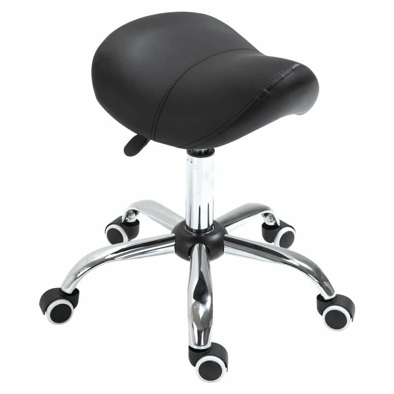 Sgabello Parrucchiere Sgabello a sella per parrucchiere regolabile nero Sgabello con cinque ruote piroettanti e seduta a sella, che si abbina facilmente in qualsiasi parrucchiere, salone estetico, o negozio di tatuaggi. L'altezza flessibilmente regolabile e la seduta confortevole vi permettono di lavorare comodamente per ore senza subire mal di schiena. Caratteristiche Sgabello a sella perfetto per parrucchiere, salone estetico, negozio di tattuaggi, e molti altri! Il sedile ergonomico a forma di sella vi permetterà di adottare una postura stabile. Design classico e alla moda, pratico e comodo da sedere. Rivestimento in similpelle resistente, facile da pulire e morbida al tatto. 5 ruote piroettanti per facilitare lo spostamento. Facile da assemblare e di poco ingombro. Ruote antiscivoli per maggior sicurezza. L'altezza è comodamente regolabile con pistone a gas galvanizzato. Seduta ben imbottita con spugna. Vi permette di stare comodi a lungo. Dati tecnici Seduta rivestita in