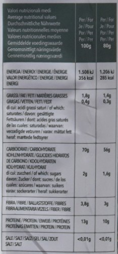 Valori nutrizionali medi per 100g: Energia 1518 kJ (358 kcal), Grassi 2,2 gr, Carboidrati 70 gr, Fibre 3,2 gr, Proteine 13 gr