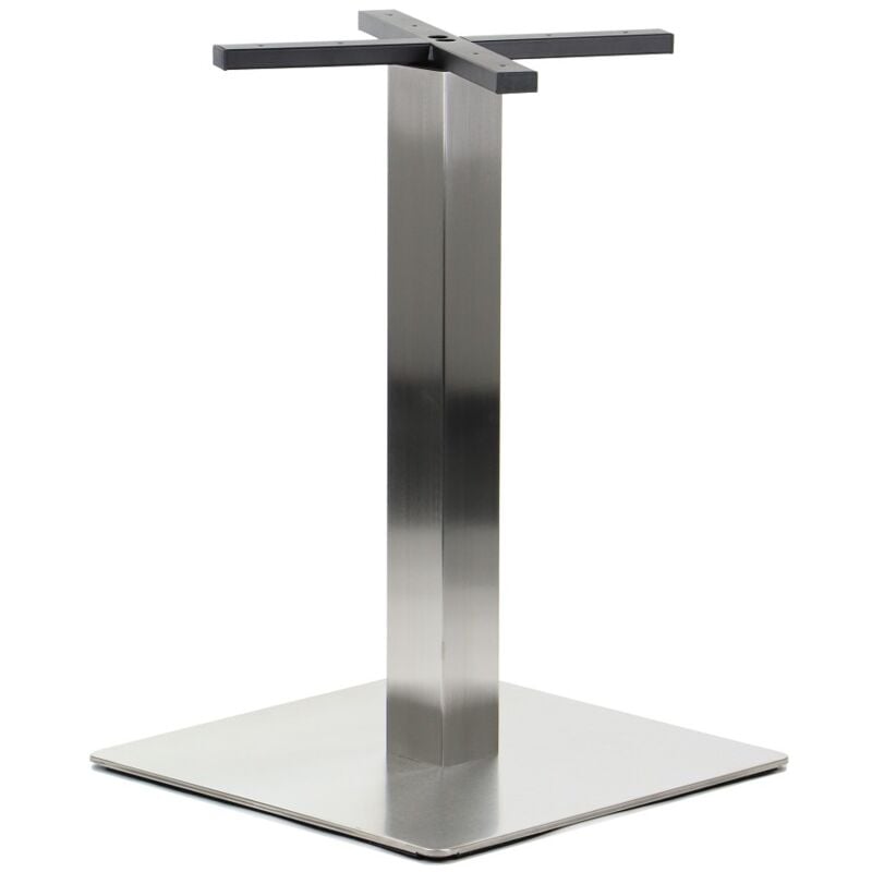 CARATTERISTICHE BASE elemento inferiore, dimensioni 50x50 cm, elemento inferiore in lamiera, spessore: 7 mm, rivestito in lamiera di acciaio inox spazzolato, gamba di sezione 80x80 mm, in acciaio inox spazzolato, spessore parete 1,2 mm, elemento superiore in profili di acciaio 45x45 cm, di sezione 4x2 cm, parte superiore elemento dotato di 8 fori di montaggio con un diametro di 5 mm, piedini regolabili, base avvitata, consegnato in elementi prodotto realizzato in acciaio inossidabile di tipo 201 - destinato all'uso all'interno in ambienti asciutti