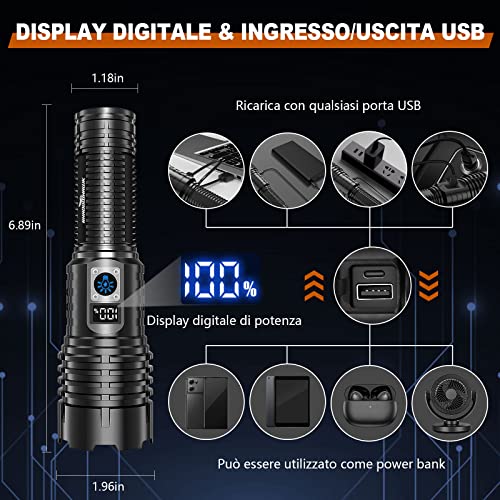 【DISPLAY DI POTENZA LCD | TORCIA LED RICARICABILE | USCITA USB】: Questa torcia ricaricabile è stata recentemente aggiornata con l'esclusivo display LCD della percentuale di potenza, che consente di conoscere sempre la potenza residua. Inoltre, la torcia led è stata completamente migliorata per ridurre il tempo di ricarica e prolungare la durata di vita, fornendo fino a 12 ore (modalità Low) di luminosità potente. Grazie all'interfaccia USB, può anche ricaricare il telefono in caso di emergenza.