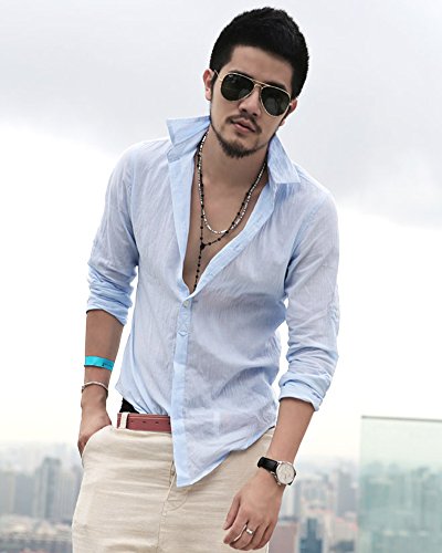 ShallGood Camicie Casual Uomo Maniche Lunghe Lino Stretch Traspirante Pulsanti Camicie Slim Fit Commercio Shirt Estiva Camicie da Spiaggia (X-Large, Blu)