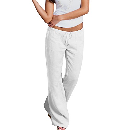 ShallGood Donna Estate Casual Taglie Forti 7/8 Lunghezza Elasticizzati Pantaloni Eleganti Coulisse Elastico Cotone Lino Palazzo Pants con Tasche Laterali Bianco X-Large