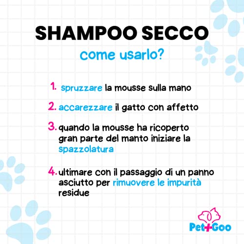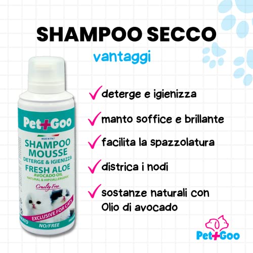 Pet+Goo Shampoo per Gatti 200ml - Mousse a Secco con Olio di Avocado - Ideale per Tutti i Tipi di Pelo - Profumato - Shampoo Delicato Senza Uso di Acqua (Fresh Aloe)
