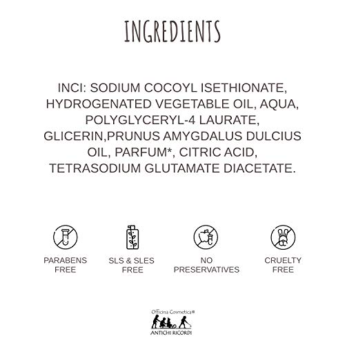I prodotti di Officina Cosmetica Antichi Ricordi sono realizzati in Italia con procedimenti artigianali e non industriali. Piccole imperfezioni, quali dimensioni leggermente differenti o eventuali piccole discromie, sono caratteristiche e proprie del particolare processo di produzione.