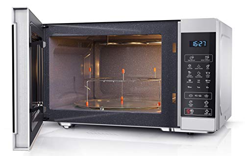 Colore esterno argentato, colore sportello: argentatonero. Accessori inclusi: piatto rotante e griglia per grill