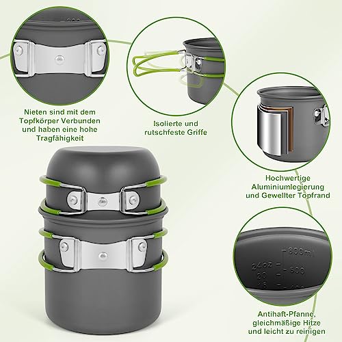 Design perfetto: sia il fornello che le pentole da campeggio e escursionismo sono pieghevoli e con una borsa a rete per risparmiare spazio. Si può riporre il tutto in un sacchetto senza problemi.