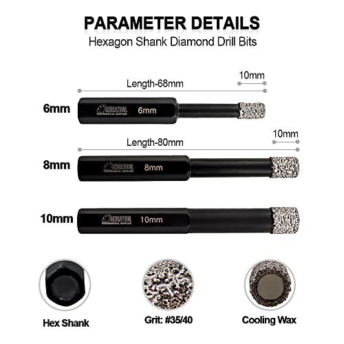 SHDIATOOL Punta per Secco Trapano Diamantata Set da 3 Pezzi ad Attacco Esagonale per Porcellana Piastrella Ceramica Marmo 6mm 8mm 10mm