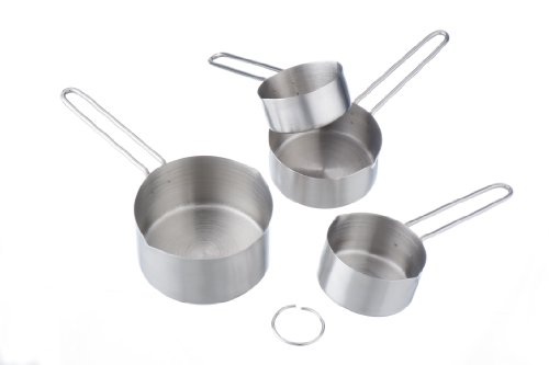 Comprende misurini da ¼, 1/3, 1/2 e 1 tazza (ossia 60ml, 80ml, 125ml e 250ml) ed un anello per tenerli tutti insieme e pronti all'uso.